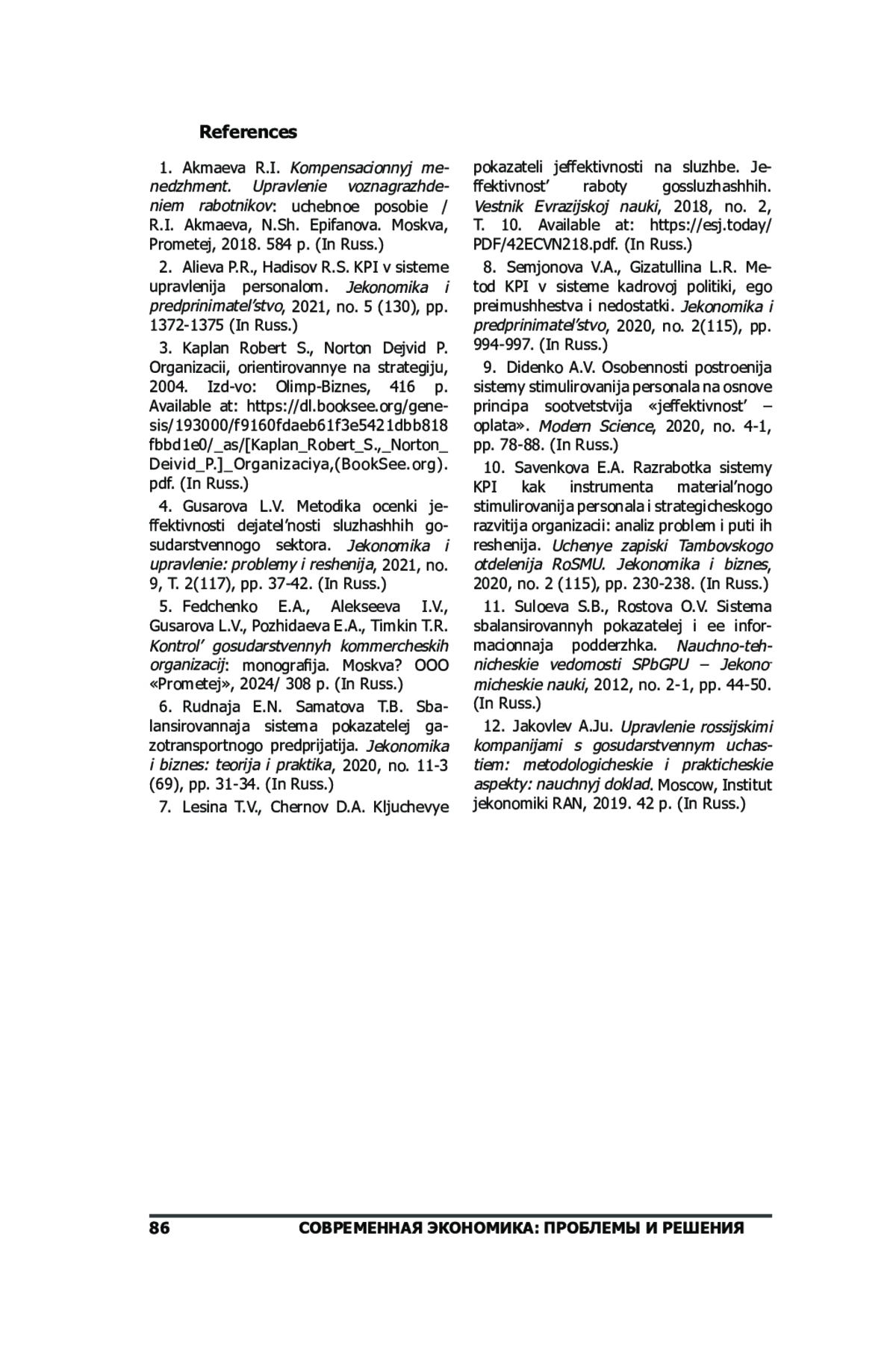 7. Лесина Т.В., Чернов Д.А. Ключевые показатели эффективности на службе. Эффективность работы госслужащих // Вестник Евразийской науки, 2018, no. 2, т. 10. Доступно: https://esj.today/PDF/42ECVN218.pdf. EDN: XSDEKD
