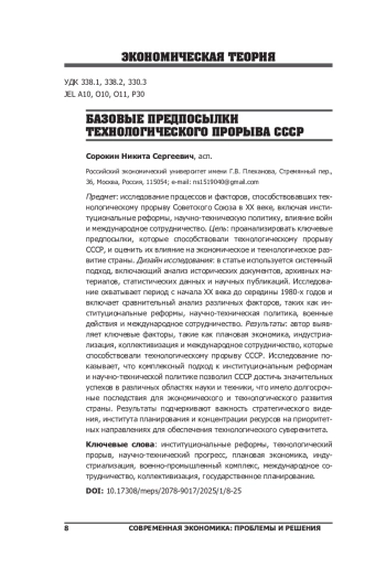Предмет, исследование процессов и факторов, способствовавших технологическому прорыву Советского Союза в XX веке, включая институциональные реформы, научно-техническую политику, влияние войн и международное сотрудничество. Цель: проанализировать ключевые предпосылки, которые способствовали технологическому прорыву СССР, и оценить их влияние на экономическое и технологическое развитие страны. Дизайн исследования: в статье используется системный подход, включающий анализ исторических документов, архивных материалов, статистических данных и научных публикаций. Исследование охватывает период с начала XX века до середины 1980-х годов и включает сравнительный анализ различных факторов, таких как институциональные реформы, научно-техническая политика, военные действия и международное сотрудничество. Результаты: автор выявляет ключевые факторы, такие как плановая экономика, индустриализация, коллективизация и международное сотрудничество, которые способствовали технологическому прорыву СССР. Исследование показывает, что комплексный подход к институциональным реформам и научно-технической политике позволил СССР достичь значительных успехов в различных областях науки и техники, что имело долгосрочные последствия для экономического и технологического развития страны. Результаты подчеркивают важность стратегического видения, института планирования и концентрации ресурсов на приоритетных направлениях для обеспечения технологического суверенитета.