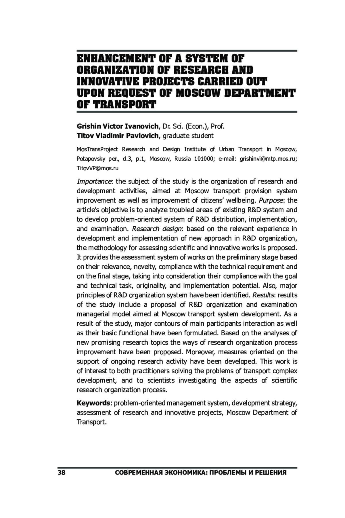 Предмет, организация научно-исследовательских и опытноконструкторских работ в целях совершенствования транспортного обеспечения города Москвы и повышения уровня благосостояния жителей города. Цель: проанализировать проблемные области существующей системы организации и проведения научно-технической политики транспортного комплекса города Москвы и разработать проблемно ориентированную систему распределения, выполнения и экспертизы соответствующих НИОКР. Дизайн исследования: на основе изложения опыта разработки и внедрения нового подхода к организации соответствующих исследований предложена методология оценки научных и инновационных работ на входе (актуальность, новизна, соответствие технического задания цели и сложности заявленной работы) и выходе (соответствие поставленным целям и техническому заданию, новизна и возможность внедрения). Выявлены и сформулированы основные принципы организации научноисследовательской работы. Результаты: предложена управленческая модель организации и экспертизы научно-технических работ, проводимых в интересах развития транспортного комплекса города Москвы. Описаны основные контуры взаимодействия и базовый функционал участников системы. Проанализирована перспективная тематика проводимых исследований и предложены направления ее совершенствования. На основе анализа ресурсного обеспечения выполнения программы разработаны меры поддержки проводимых мероприятий. Работа может быть интересна как практикам, занимающимся проблемами развития транспортного комплекса, так и ученым, изучающим вопросы организации научных исследований.