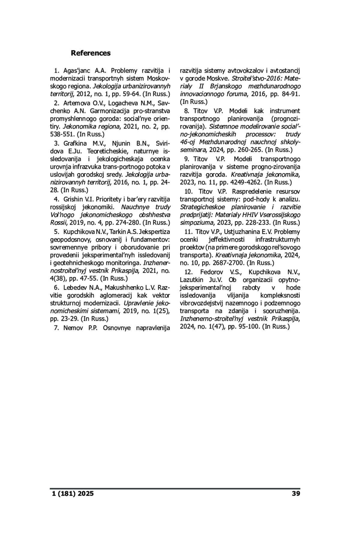 1. Агасьянц А.А. Проблемы развития и модернизации транспортных систем Московского региона // Экология урбанизированных территорий, 2012, no. 1, c. 59-64. EDN: PAMKDJ