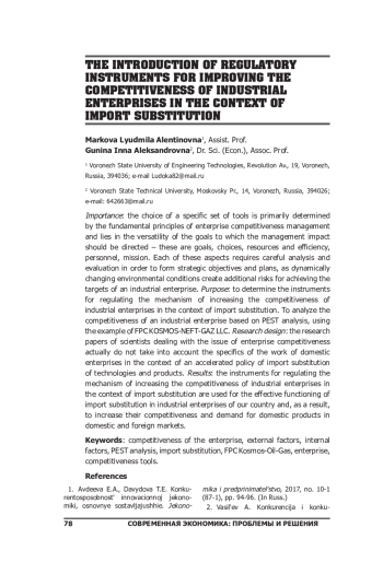 Предмет: выбор определенного набора инструментов прежде всего определяется фундаментальными основами управления конкурентоспособностью предприятия и заключается в многогранности целей, на которые должно быть направлено управляющее воздействие - это цели, выбор, ресурсы и эффективность, персонал, миссия. Каждый из этих аспектов требует внимательного анализа и оценки для формирования стратегических задач и планов, так как динамично меняющиеся условия внешней среды создают дополнительные риски реализации целевых показателей промышленного предприятия. Цель: определить инструменты регулирования механизма повышения конкурентоспособности промышленных предприятий в условиях импортозамещения. Проанализировать конкурентоспособность промышленного предприятия на основе PEST-анализа на примере ООО ФПК «КОСМОС-НЕФТЬ-ГАЗ». Дизайн исследования: в исследовательских работах ученых, затрагивающих вопрос конкурентоспособности предприятия фактически не берется во внимание специфика работы отечественных предприятий в условиях ускоренной политики импортозамещения технологий и продукции. Результаты: инструменты регулирования механизма повышения конкурентоспособности промышленных предприятий в условиях импортозамещения применяются для эффективного функционирования импортозамещения на промышленных предприятиях нашей страны и, как следствие, - повышение их конкурентоспособности и спроса на отечественную продукцию на внутреннем и внешних рынках.