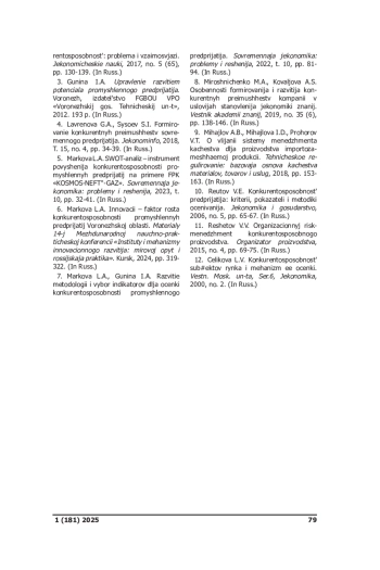 7. Маркова Л.А., Гунина И.А. Развитие методологии и выбор индикаторов для оценки конкурентоспособности промышленного предприятия // Современная экономика: проблемы и решения, 2022, т. 10, с. 81-94. EDN: MONEWX