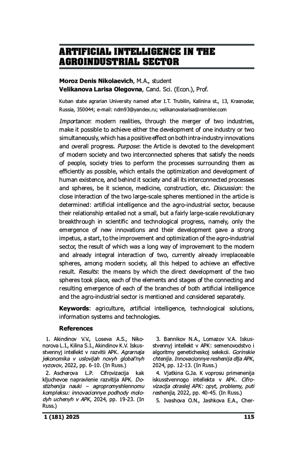 Предмет: современные реалии посредством слияния двух отраслей позволяют достичь либо развития одной отрасли, либо двух одновременно, что благополучно отражается как на внутриотраслевых инновациях, так и всеобщем прогрессе. Цель: статья посвящена развитию современного общества и двух связанных сфер, удовлетворяющих потребности людей, общество пытается максимально эффективно исполнять процессы окружающие их, что влечет за собой оптимизацию и развитие человеческого бытия, а за ним общество и всех связанных его процессов и сфер, будь то наука, медицина, строительство и прочее. Обсуждение: определено тесное взаимодействие упомянутых в статье двух масштабных сфер: искусственного интеллекта и агропромышленного сектора, ведь их взаимосвязь повлекла за собой не малый, довольно масштабный революционный прорыв в научно-техническом прогрессе, а именно только появление новых инноваций и их развитие, дало сильный толчок, старт, к улучшению и оптимизации агропромышленного сектора, следствием чего стал долгий путь улучшения до современного и уже неотъемлемого взаимодействия двух на текущий момент уже незаменимых сфер среди современного общества, все это помогло добиться эффективного результата. Результаты: средства, при помощи которых происходило непосредственное развитие двух сфер, по отдельности упоминается и рассматривается каждый из элементов и этапов связующей и результирующей появлению каждой из отрасли как искусственного интеллекта, так и агропромышленного сектора.