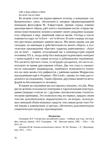 Авторы статьи исследуют особенности использования повторов и параллельных конструкций в поэзии Дж. Моррисона с целью выяснить, какую задачу решал поэт, прибегая к указанным стилистическим приемам. Изучив ряд контекстов, авторы заключают, что средства синтаксиса позволяют Моррисону сделать свой текст более содержательным и выразительным, а также обеспечить дополнительную семантическую нагрузку текста.