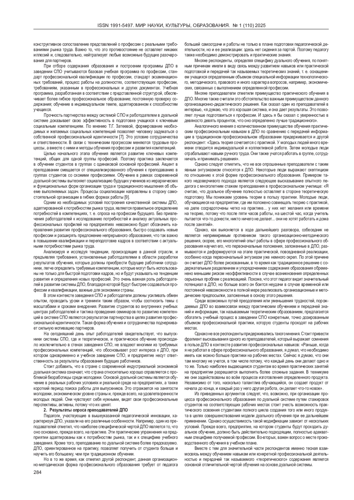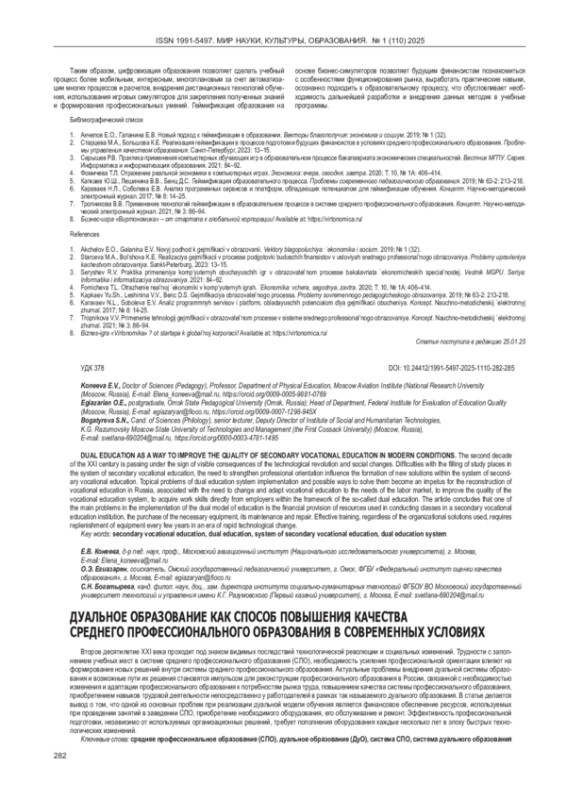 КОНЕЕВА Е. В., ЕГИАЗАРЯН О. Э., БОГАТЫРЕВА С. Н. ДУАЛЬНОЕ ОБРАЗОВАНИЕ КАК СПОСОБ ПОВЫШЕНИЯ КАЧЕСТВА СРЕДНЕГО ПРОФЕССИОНАЛЬНОГО ОБРАЗОВАНИЯ В СОВРЕМЕННЫХ УСЛОВИЯХ // МИР НАУКИ, КУЛЬТУРЫ, ОБРАЗОВАНИЯ. 2025. № 1 (110)