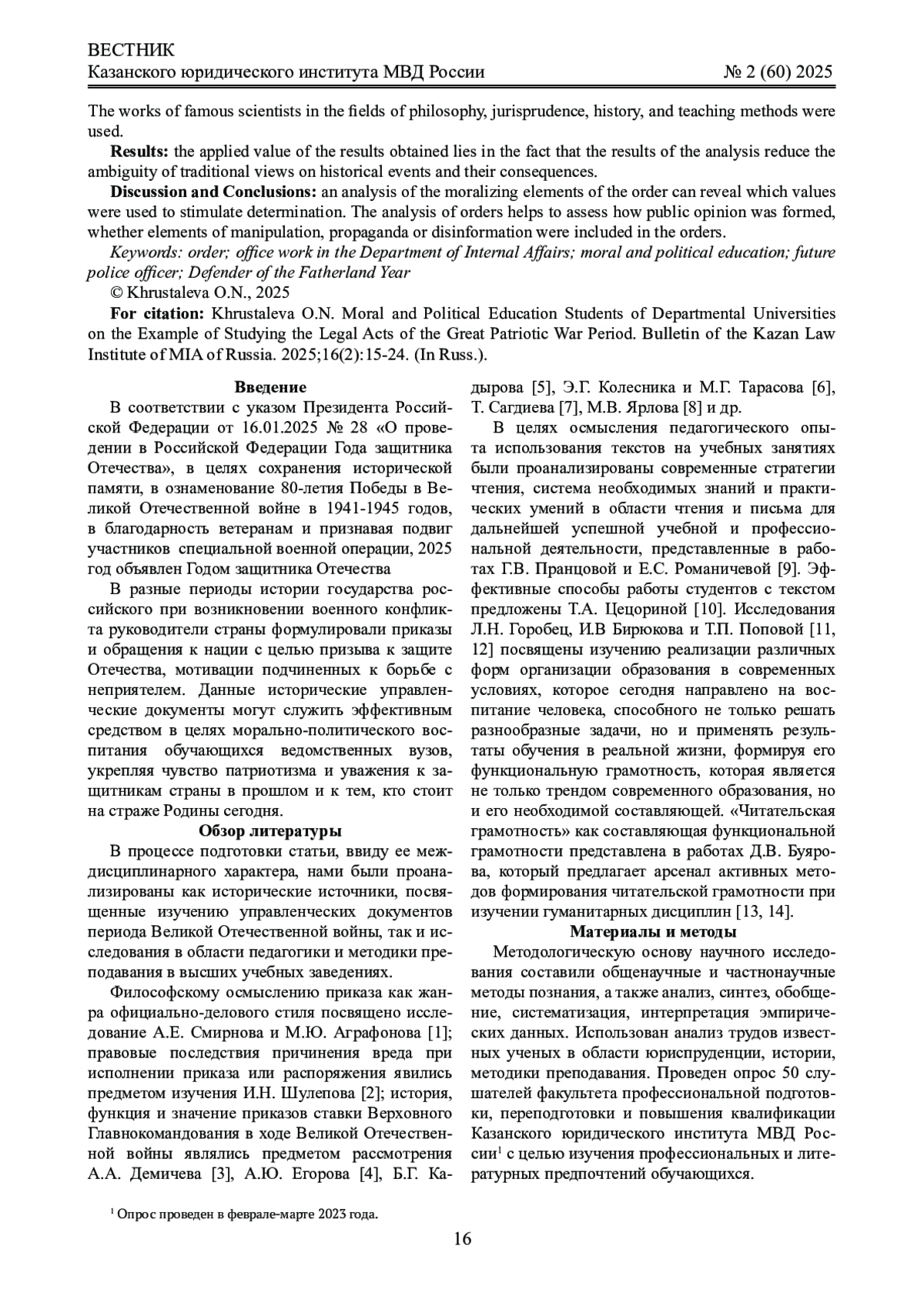 Введение: в статье раскрываются дидактические возможности использования текстов исторических документов на занятиях в ведомственном вузе в воспитательных целях. Материалы и методы: в основе проведенного исследования - диалектический метод познания действительности; применялись общенаучные и частнонаучные методы (опрос, логический, формально-юридический, системно-структурный анализ). Использовались труды известных ученых в области философии, юриспруденции, истории, методики преподавания. Результаты исследования: прикладная ценность полученных результатов состоит в том, что итоги проведенного анализа снижают неоднозначность традиционных взглядов на исторические события и их последствия. Обсуждение и заключение: анализ морализующих элементов приказа призван выявить, какие ценности использовались для стимулирования решимости. Анализ приказов помогает оценить, как формировалось общественное мнение, были ли включены в приказы элементы манипуляции, пропаганды или дезинформации.