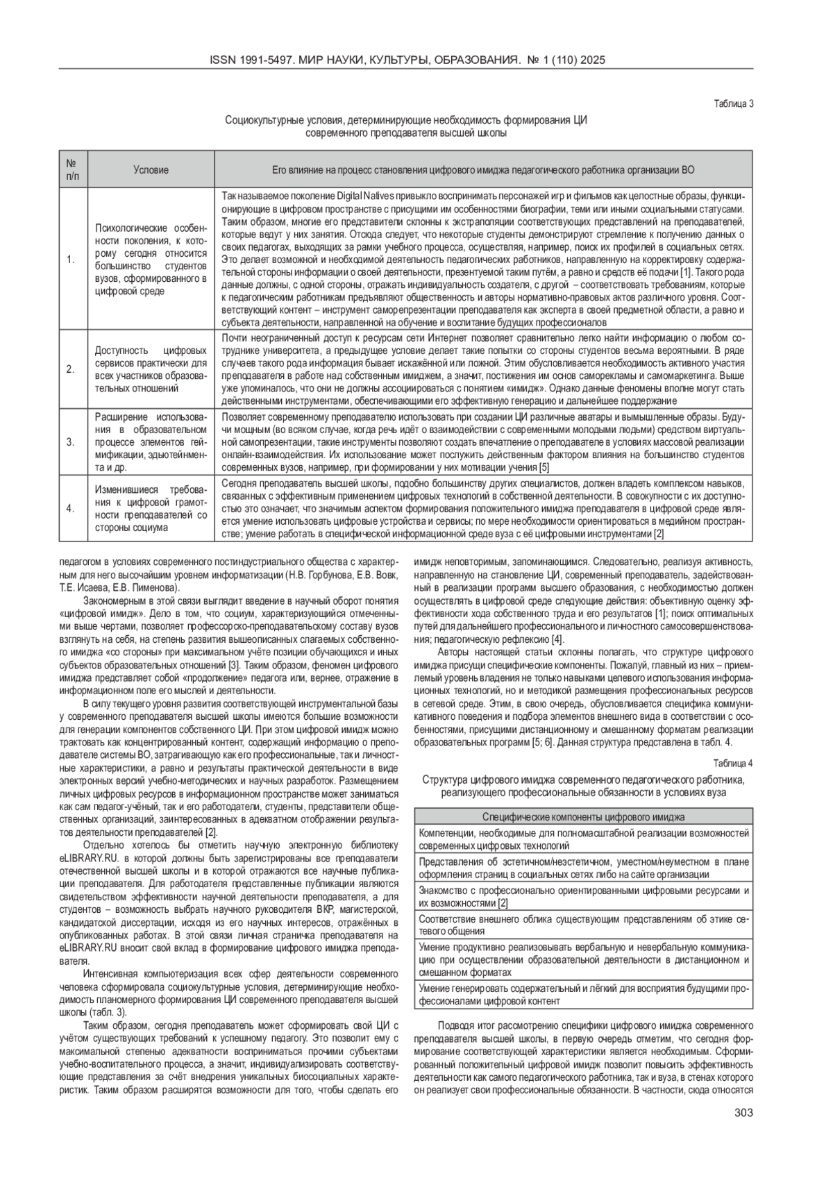 3. Горбунова Н.В., Вовк Е.В. Особенности цифрового имиджа педагога высшей школы. Мир науки, культуры, образования. 2023; № 2 (99): 302-305. EDN: JPMVAA