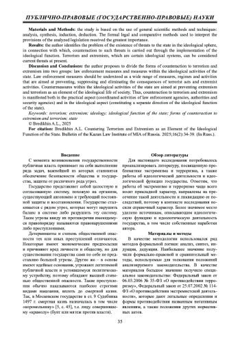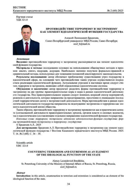 Обсуждение и заключение: автор предлагает разделить формы противодействия терроризму и экстремизму на две группы: правоохранительные меры и меры в рамках идеологической деятельности государства. Под правоохранительными мерами следует понимать широкий спектр мероприятий, режимов и деятельности, которые направлены на предотвращение, пресечение и ликвидацию последствий террористических актов и экстремистской деятельности. Меры противодействия в рамках идеологической деятельности государства направлены на недопущение экстремизма и терроризма как элемента идеологической жизни общества. Таким образом, противодействие терроризму и экстремизму проявляется как в практическом аспекте (согласованной деятельности правоохранительных органов, органов власти и силовых ведомств), так и идеологическом (составляющим отдельное направление идеологической функции государства).