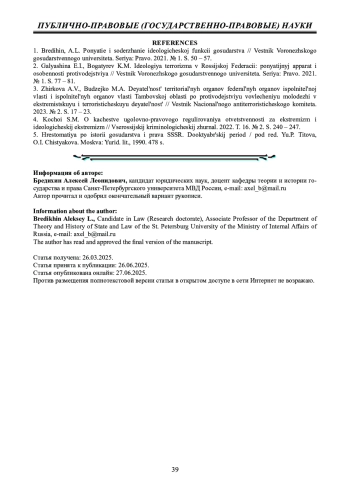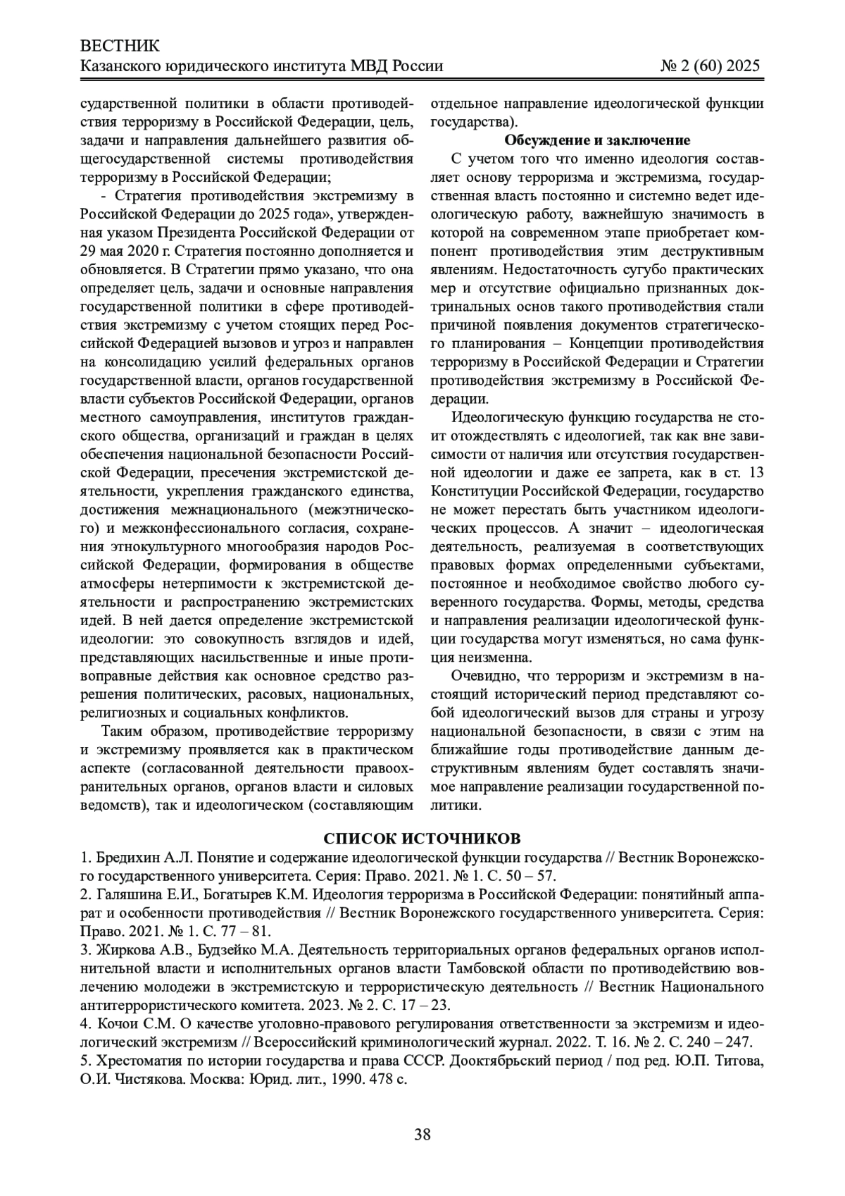 2. Галяшина Е.И., Богатырев К.М. Идеология терроризма в Российской Федерации: понятийный аппарат и особенности противодействия // Вестник Воронежского государственного университета. Серия: Право. 2021. № 1. С. 77 - 81.
