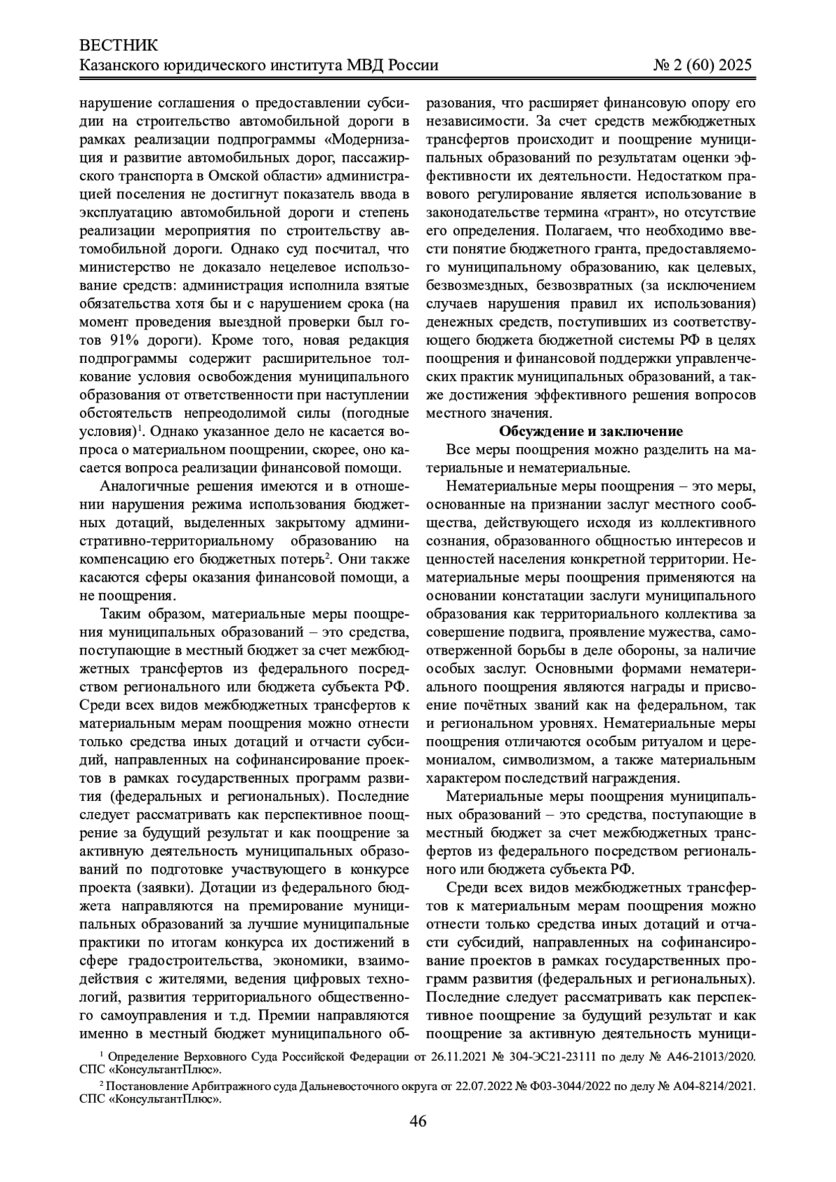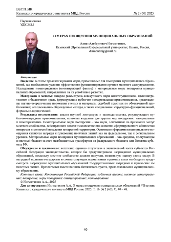 3. Нигметзянов А.А. Поощрение муниципальных образований: понятие и сущность // Актуальные проблемы российского права. 2024. Т. 19, № 8 (165). С. 46 - 56. DOI: 10.17803/1994-1471.2024.165.8.046-056 EDN: VFASFR
