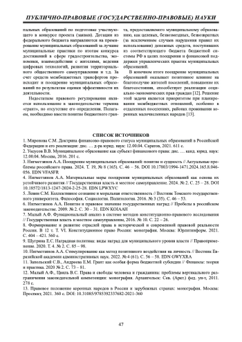 1. Миронова С.М. Доктрина финансово-правового статуса муниципальных образований в Российской Федерации и его реализация: дис. … д-ра юрид. наук: 12.00.04. Саратов, 2021. 611 с. EDN: DDCGYY