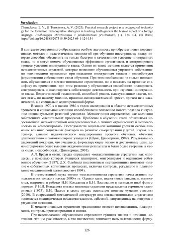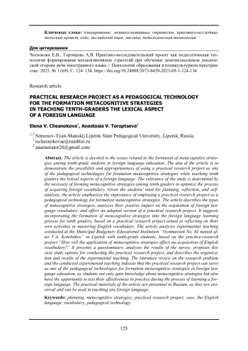 Статья посвящена вопросам изучения проблемы формирования метакогнитивных стратегий у десятиклассников при обучении иностранному языку. Цель статьи - показать возможность и целесообразность использования практико-исследовательского проекта как одной из педагогических технологий формирования метакогнитивных стратегий при обучении десятиклассников лексической стороне речи иностранного языка. Актуальность исследования обусловлена необходимостью формирования метакогнитивных стратегий у десятиклассников для оптимизации процесса усвоения иноязычной лексики. Учитывая потребность десятиклассников к планированию, рефлексии и самоанализу, показана необходимость использования практико-исследовательского проекта как педагогической технологии для формирования метакогнитивных стратегий. В статье описаны виды метакогнитивных стратегий, проанализировано их положительное влияние на усвоение лексики иностранного языка, а также предложен адаптированный вариант практико-исследовательского проекта. Предлагается включение в процесс обучения десятиклассников иностранному языку формирование метакогнитивных стратегий на основе практико-исследовательского проекта, направленного на рефлексию собственной деятельности по усвоению лексики английского языка. В статье проанализировано опытное обучение, проведенное в МБОУ «Гимназия № 64 имени В. А. Котельникова» города Липецка с учащимися десятого класса на основе практико-исследовательского проекта «Как применение метакогнитивных стратегий повлияет на мое усвоение лексики английского языка?»: представлена анкета, проанализированы результаты анкетирования, предложены 5 вариантов кейсов для проведения практико-исследовательского проекта, описаны организация и результаты опытного обучения. Анализ литературы по проблеме исследования и проведенное опытное обучение показали, что практико-исследовательский проект может являться одной из педагогических технологий формирования метакогнитивных стратегий при обучении иностранному языку, так как обучающиеся не только получают знания о метакогнитивных стратегиях, но и могут проверить их эффективность на практике в процессе изучения иностранного языка. Практические материалы статьи представлены на русском языке, так как они носят универсальный характер и могут быть использованы при обучении любому иностранному языку.