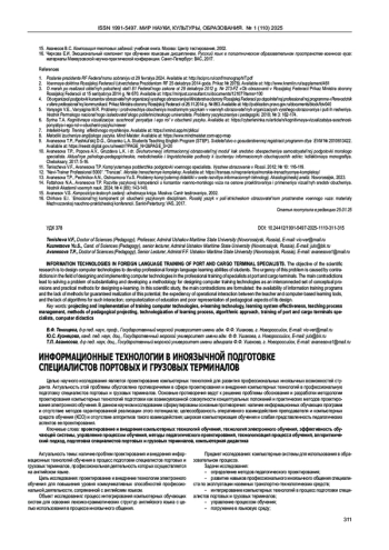 3. Тенищева В.Ф., Кузнецова Ю.С., Цыганко Е.Н. Совершенствование профессиональной иноязычной подготовки будущих инженеров в сфере эксплуатации оборудования портов и терминалов. Вестник государственного морского университета имени адмирала Ф.Ф. Ушакова. 2021 № 2 (35): 89. EDN: OHPBZE