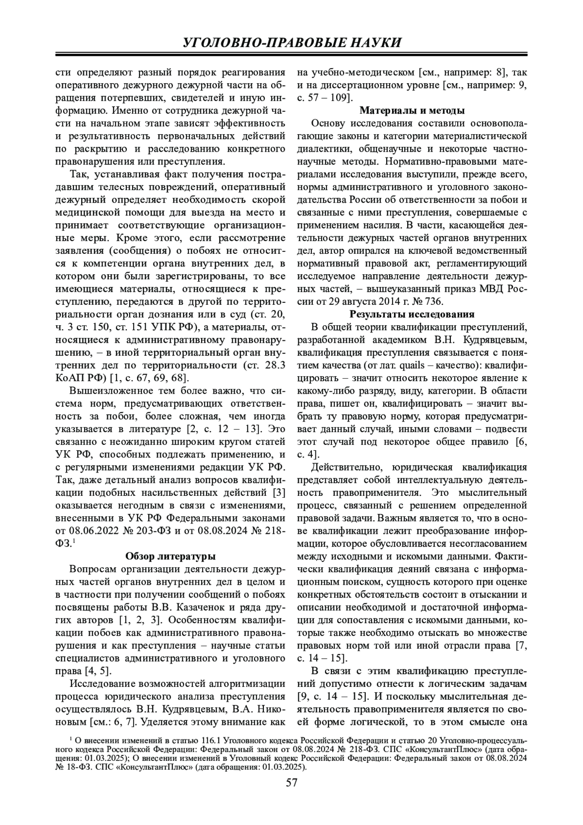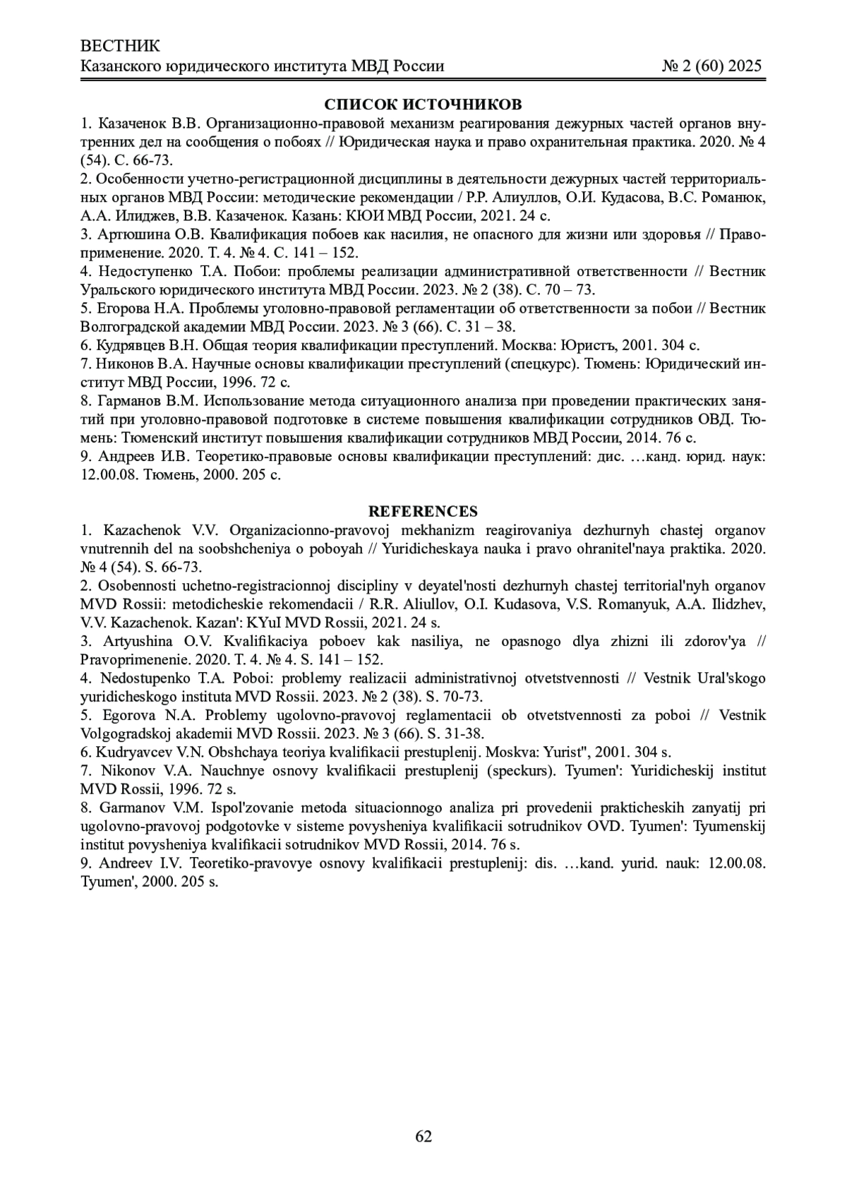 1. Казаченок В.В. Организационно-правовой механизм реагирования дежурных частей органов внутренних дел на сообщения о побоях // Юридическая наука и право охранительная практика. 2020. № 4 (54). С. 66-73. EDN: YGXZAG