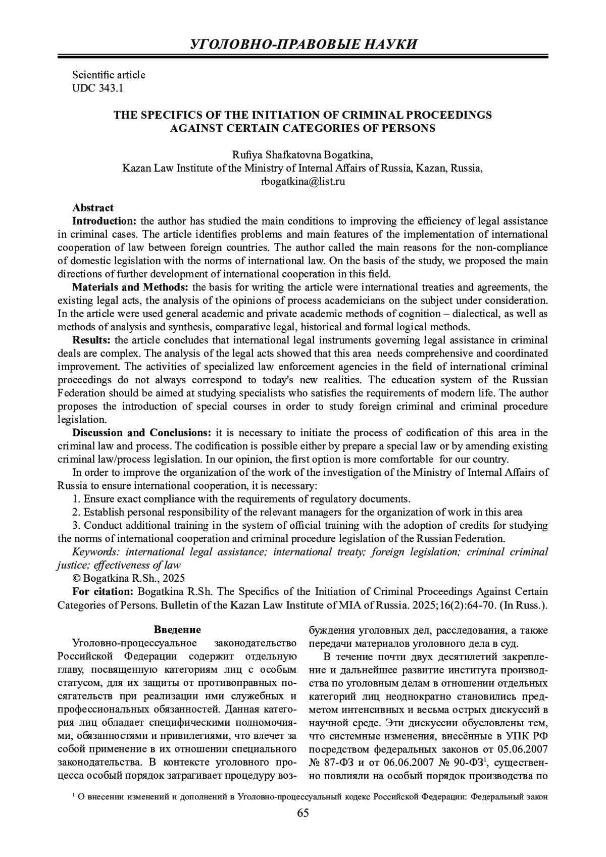4. Латыпов Т.Р. О применении положений главы 52 УПК РФ при возбуждении уголовных дел в отношении отдельных категорий лиц // Журнал российского права. 2023. № 8. С. 59 - 65.