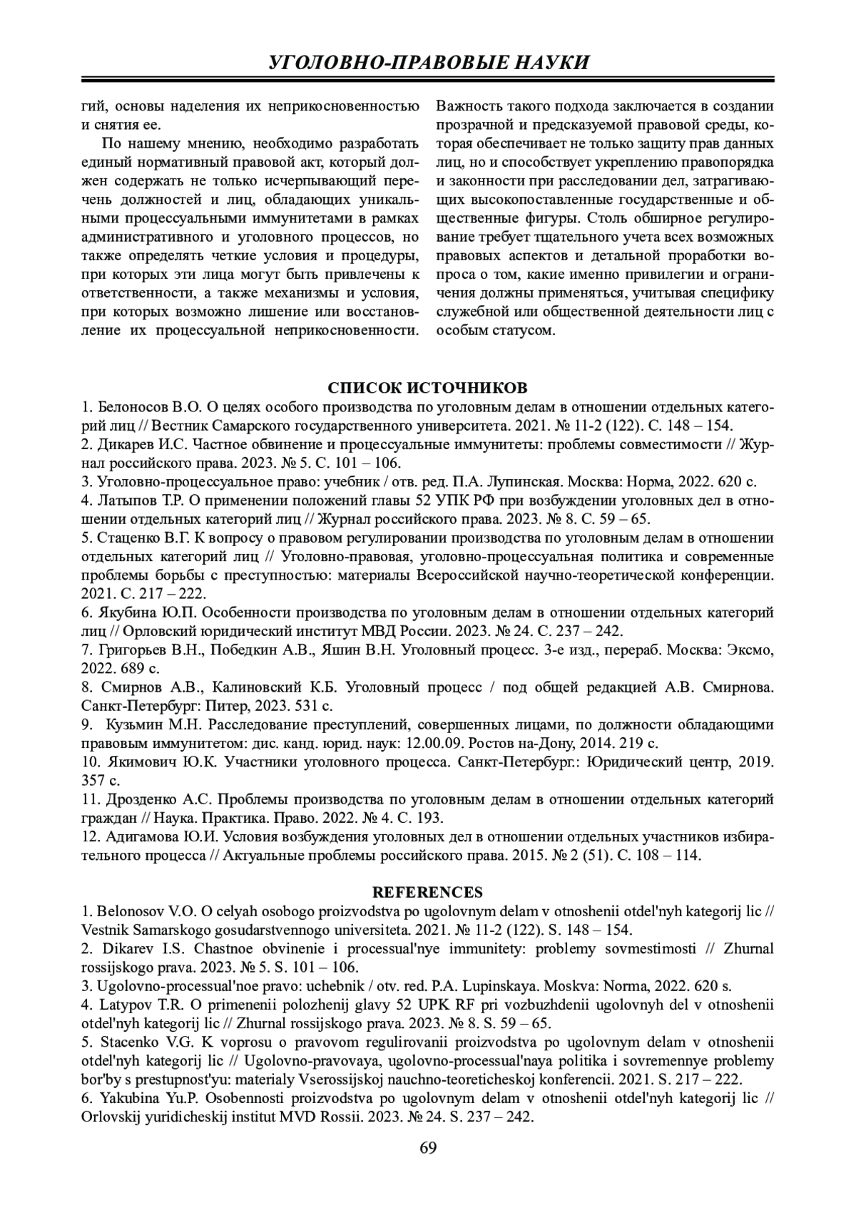 11. Дрозденко А.С. Проблемы производства по уголовным делам в отношении отдельных категорий граждан // Наука. Практика. Право. 2022. № 4. С. 193.