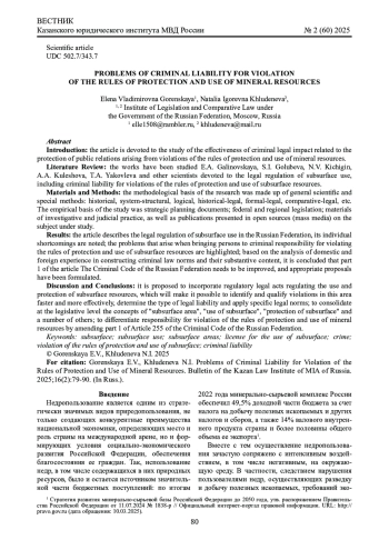 12. Яковлева Т.А., Капралов П.В. Предмет посягательства и значительный ущерб как необходимые признаки квалификации состава преступления, предусмотренного ч. 1 ст. 255 УК РФ “Нарушение порядка охраны и использования недр” // Аграрное и земельное право. 2024. № 8 (236). С. 260 - 262. ;. DOI: 10.47643/1815-1329_2024_8_259 EDN: FSBANO