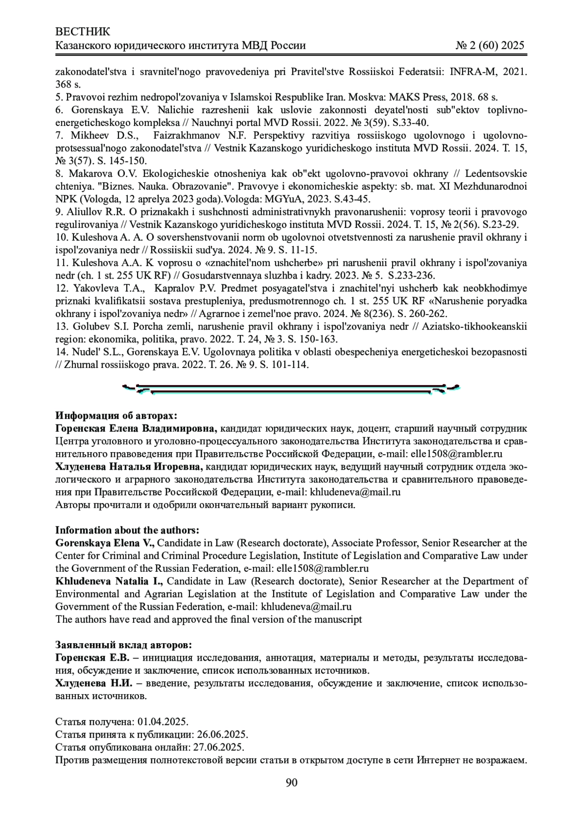 8. Макарова О.В. Экологические отношения как объект уголовно-правовой охраны // Леденцовские чтения. “Бизнес. Наука. Образование”. Правовые и экономические аспекты: сб. мат. XI Международной НПК (Вологда, 12 апреля 2023 года). Вологда: МГЮА, 2023. С.43 - 45. EDN: TBHHZW