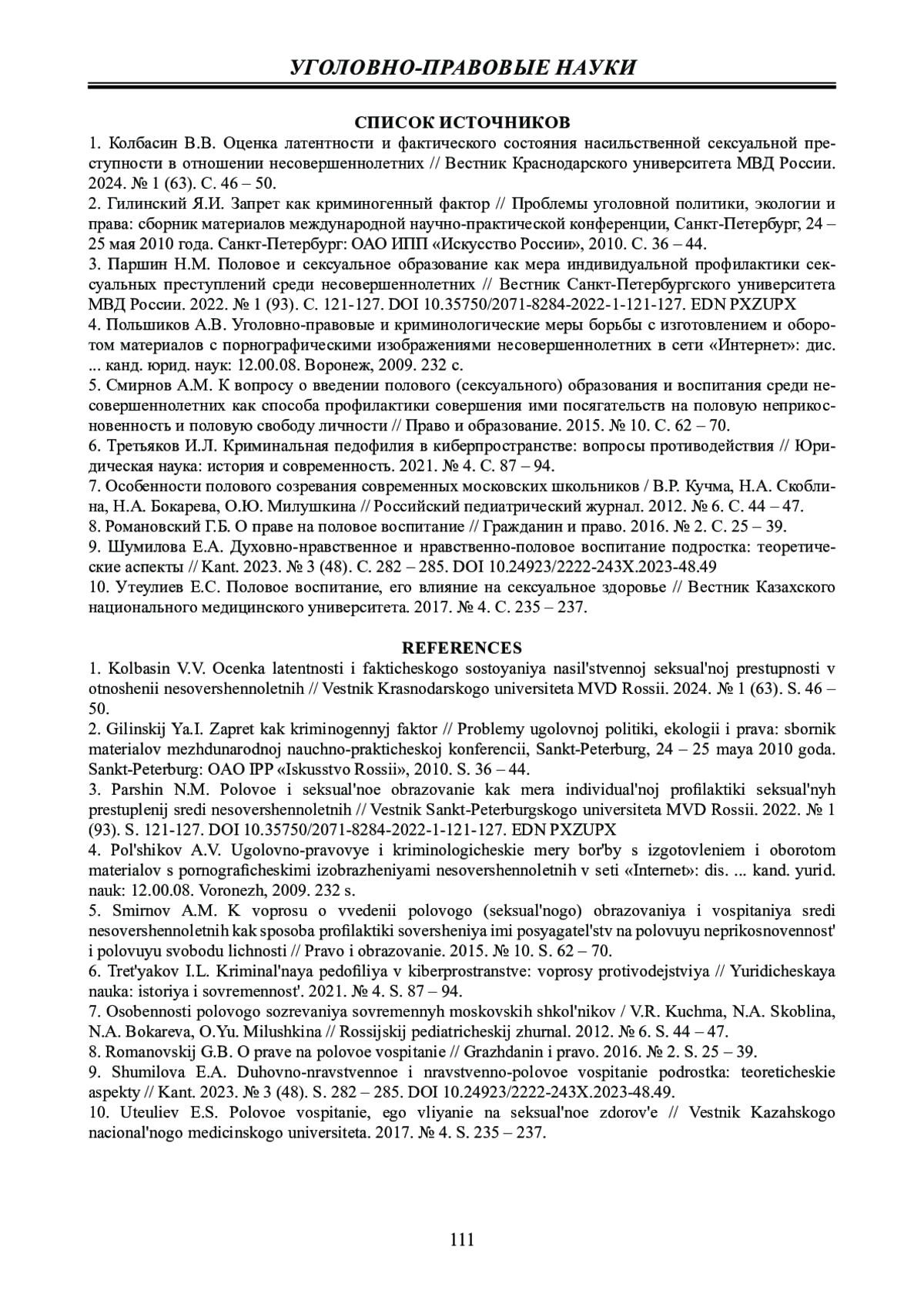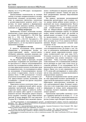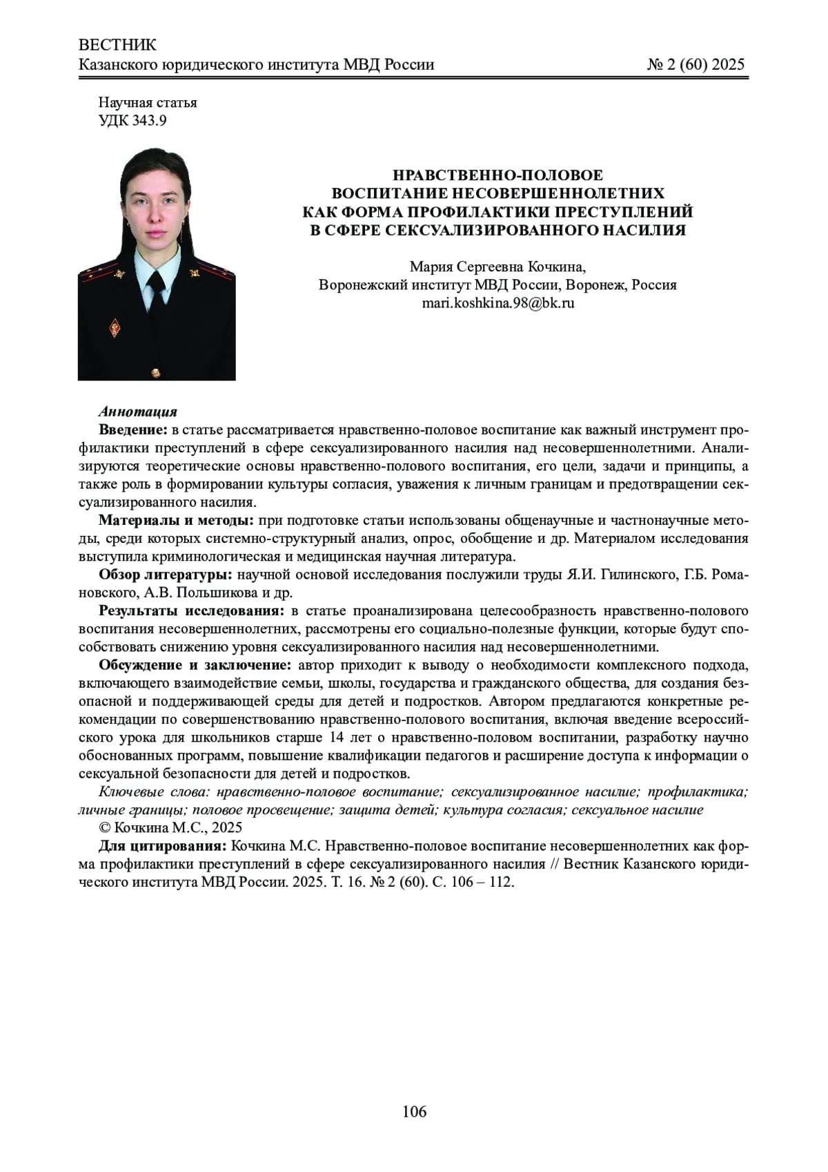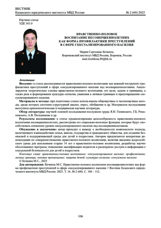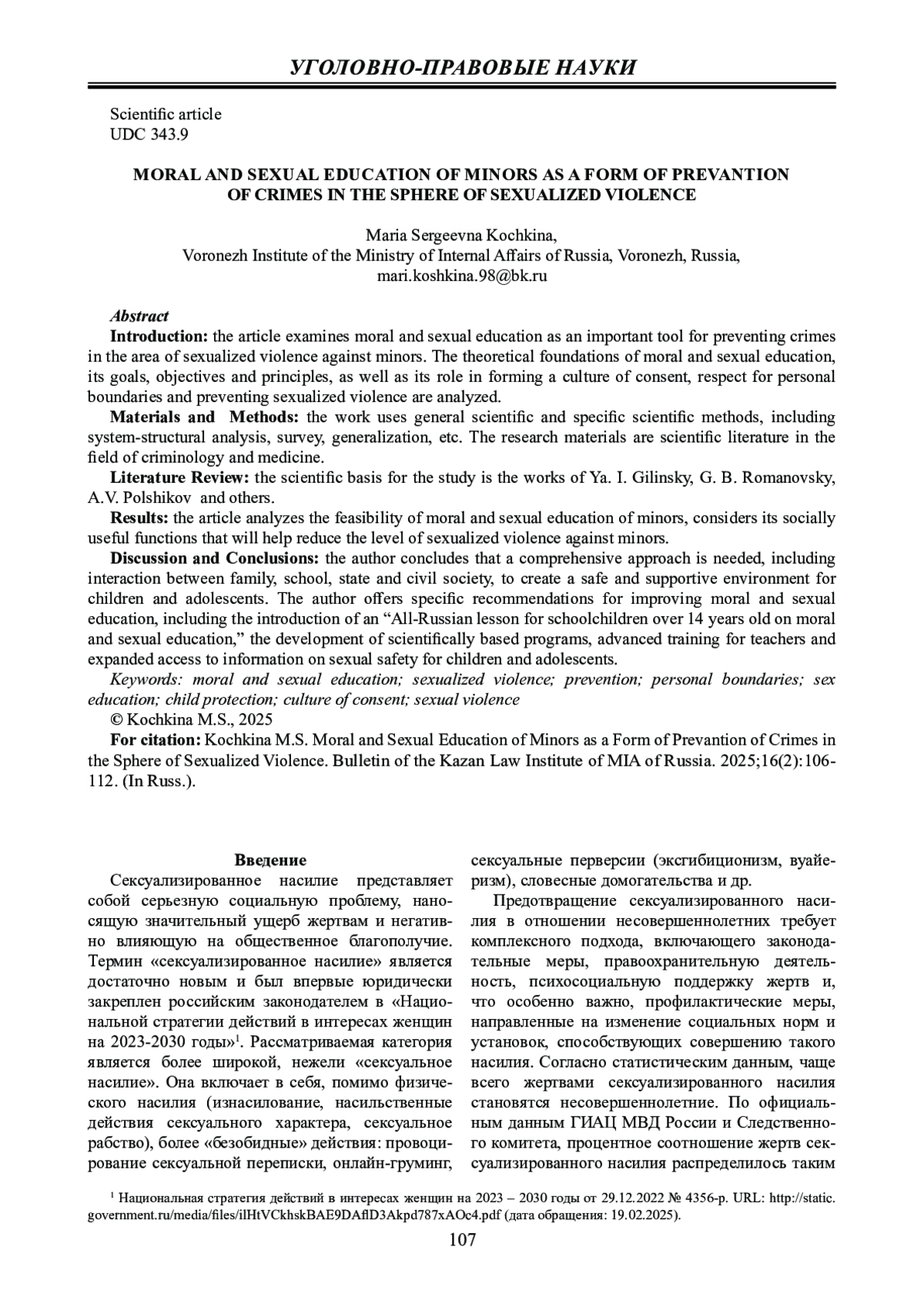 КОЧКИНА М. С. НРАВСТВЕННО-ПОЛОВОЕ ВОСПИТАНИЕ НЕСОВЕРШЕННОЛЕТНИХ КАК ФОРМА ПРОФИЛАКТИКИ ПРЕСТУПЛЕНИЙ В СФЕРЕ СЕКСУАЛИЗИРОВАННОГО НАСИЛИЯ // ВЕСТНИК КАЗАНСКОГО ЮРИДИЧЕСКОГО ИНСТИТУТА МВД РОССИИ. 2025. Т. 16 № 2 (60)