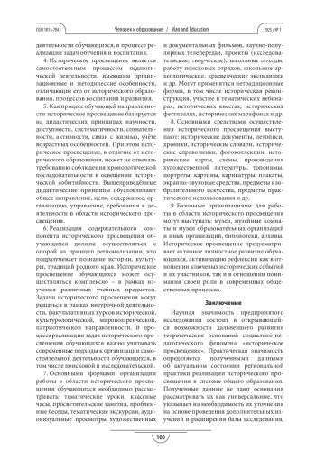 Статья посвящена изучению социально-педагогического феномена «историческое просвещение», анализу сложившейся практики реализации исторического просвещения в системе общего образования. Проведён терминологический анализ, позволивший проследить эволюцию значения и употребления понятия «историческое просвещение», уточнить его признаки и свойства. Предложено авторское определение исторического просвещения, раскрывающее его педагогическую сущность и смысловое значение. Историческое просвещение в России представлено как специально организованный педагогический процесс, направленный на создание условий для повышения уровня исторической памяти и сохранения традиционных духовно-нравственных и культурно-исторических ценностей. Представлены результаты предпринятого исследования с целью изучения актуального состояния региональной практики реализации исторического просвещения исторической грамотности личности, которая рассматривается как основа для формирования общероссийской гражданской идентичности, коллективной в общеобразовательных организациях. Достоверность полученных результатов подтверждена избранной методологией исследования, выстроенной на основе применения системного, деятельностного и социокультурного подходов. Предложены рекомендации по организации педагогической деятельности в области исторического просвещения обучающихся общеобразовательной школы.