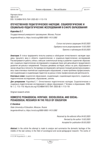 В статье предпринята попытка анализа и обобщения отечественного наследия середины прошлого века в области социологических и социально-педагогических исследований. Рассматриваются работы учёных, внёсших значительный вклад в развитие социологии образования, социально-педагогических исследований и создавших базис для дальнейшего продуктивного развития актуальных направлений. Показана динамика взглядов учёных на роль образования в жизни общества и личности. На примере исследований и авторских позиций рассмотрена взаимосвязь таких ключевых понятий, как социализация и образование, а также проблемы профессиональной социализации и социализации педагогов на разных этапах профессиональной деятельности.