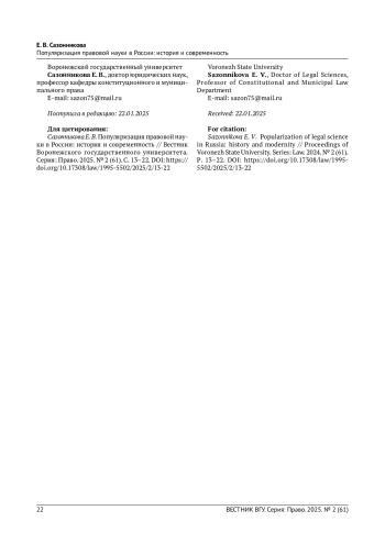 Публикация посвящена проблематике популяризации правовой науки и приурочена к 105-летию юридического факультета ВГУ. Автор обращается к истории явления, раскрывает собственное понимание популяризации правовой науки, приходит к выводу о необходимости дальнейшего развития этого направления педагогической и просветительской деятельности в юриспруденции, уделяет отдельное внимание краеведческой тематике, в том числе прошлому и современному опыту популяризации права сотрудниками юридического факультета ВГУ.