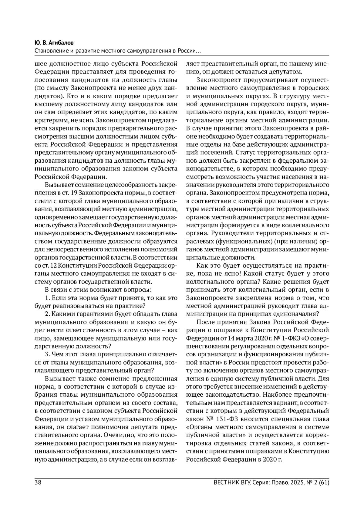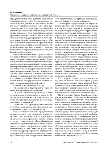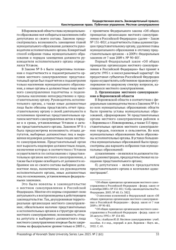 2. Агибалов Ю. В. Становление и развитие института главы муниципального образования в России: теоретические и правовые основы // Вестник Воронеж. гос. ун-та. Серия: Право. 2022. № 4. С. 353-365.