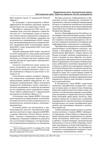 5. Пронякина С. Ю. Сравнительный анализ правового регулирования вопросов двойного гражданства в странах межгосударственного объединения БРИКС // Конституционное и муниципальное право. 2023. № 7. С. 42-46. EDN: QNBWKE