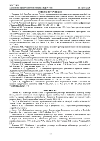 7. Игнатьева М.В. Эффективность и перспективы правового регулирования электронного правосудия // Образование и право. 2021. № 9. С. 242 - 245. ;. DOI: 10.24412/2076-1503-2021-9-242-245 EDN: RYPRBX