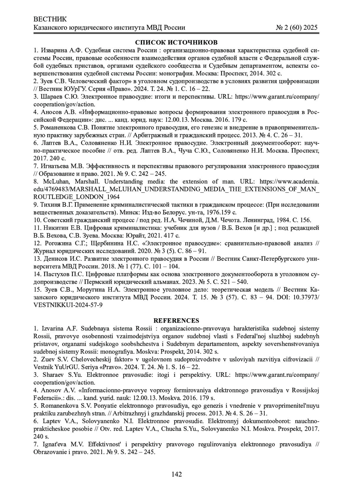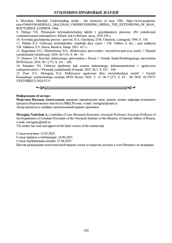 15. Зуев С.В., Моругина Н.А. Электронное уголовное дело: теоретическая модель // Вестник Казанского юридического института МВД России. 2024. Т. 15. № 3 (57). С. 83 - 94. DOI: 10.37973/VESTNIKKUI-2024-57-9 EDN: CQSDYT