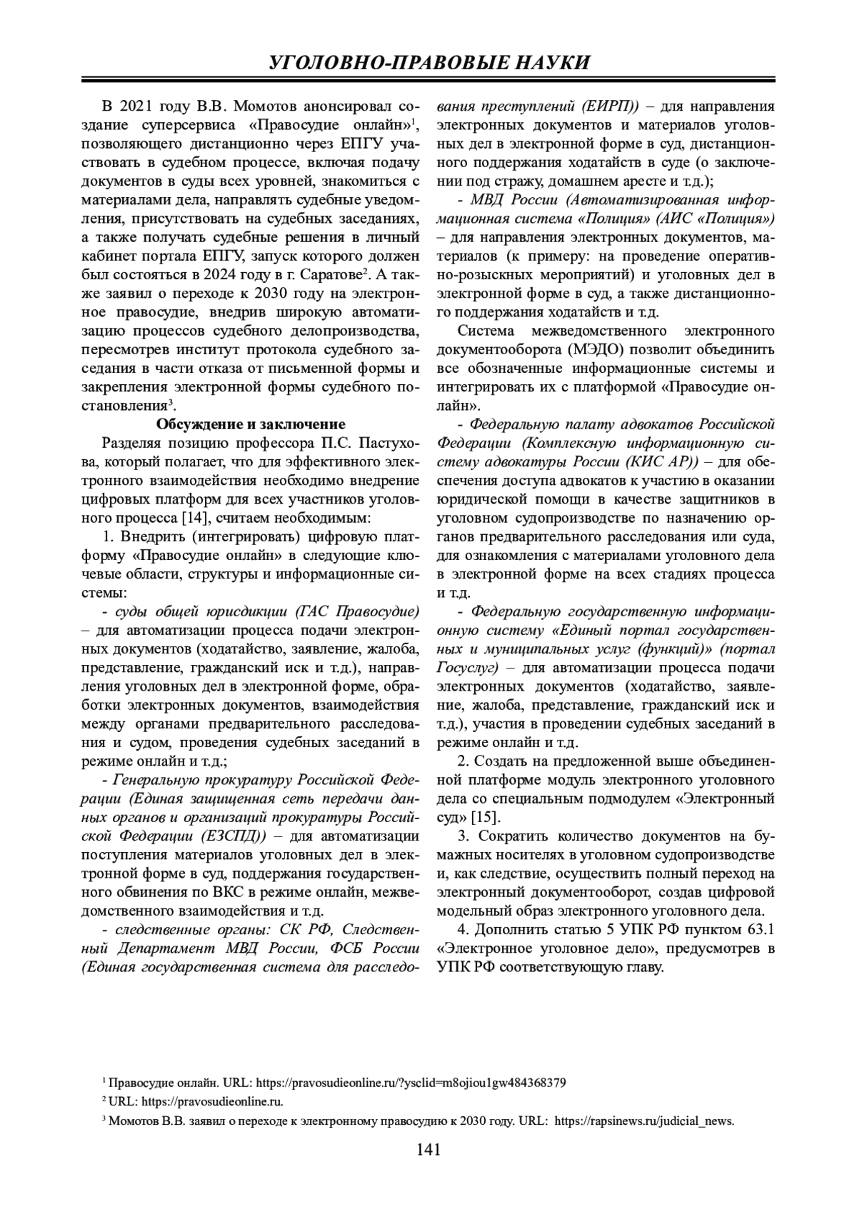 Обсуждение и заключение: сформулированы выводы о необходимости внедрения цифровой платформы «Правосудие онлайн» в основные ключевые области, структуры и информационные системы.
