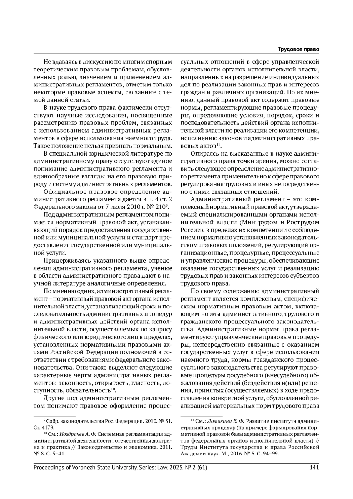 Разработка и принятие административных регламентов, регулирующих деятельность Минтруда и Роструда, их территориальных органов, а также должностных лиц, в сфере оказания различных государственных услуг в области использования различных видов наемного труда, как и всех остальных регламентов, утверждаемых федеральными и исполнительными органами власти, осуществляется на основе федерального законодательства, включающего: Федеральный закон от 27 июля 2010 г. № 210-ФЗ «Об организации предоставления государственных и муниципальных услуг»3; постановление Правительства РФ от 20 июля 2021 г. № 1228 «Об утверждении Правил разработки и утверждения регламентов предоставления государственных и муниципальных услуг»4; постановление Правительства РФ от 14 октября 2023 г. № 1706 «Об особенностях разработки, согласования, проведения экспертизы и утверждения административных регламентов предоставления государственных услуг в 2024 и 2025 годах, в том числе без использования федеральной информационной системы, обеспечивающей ведение федерального реестра государственных услуг»5 и другие нормативные правовые акты.
