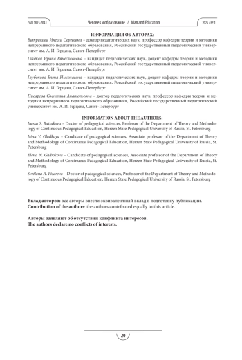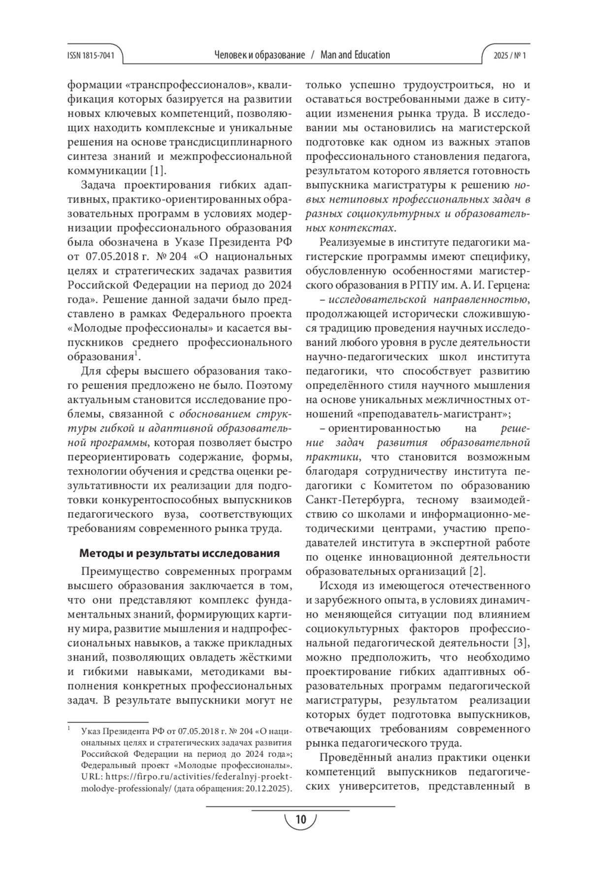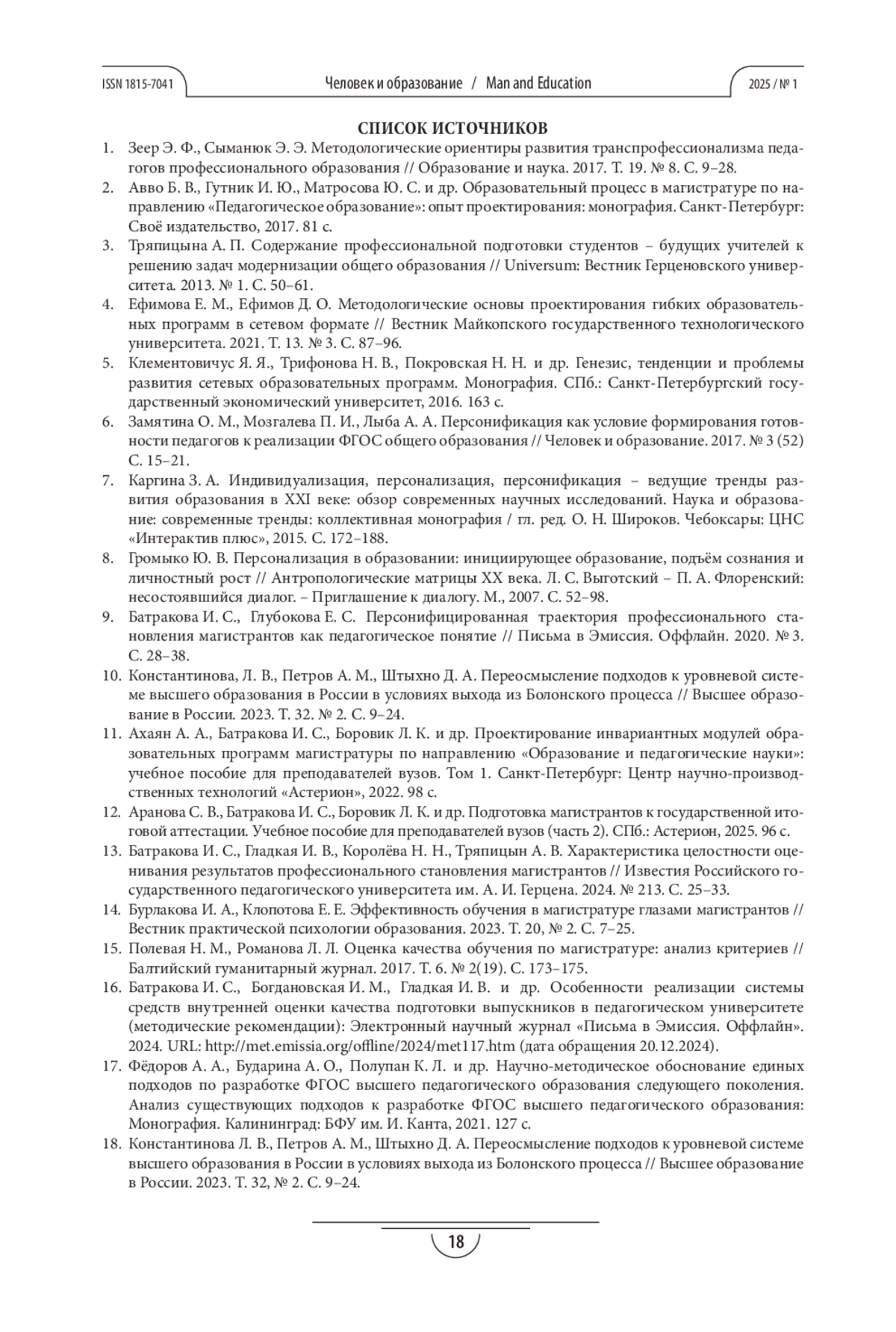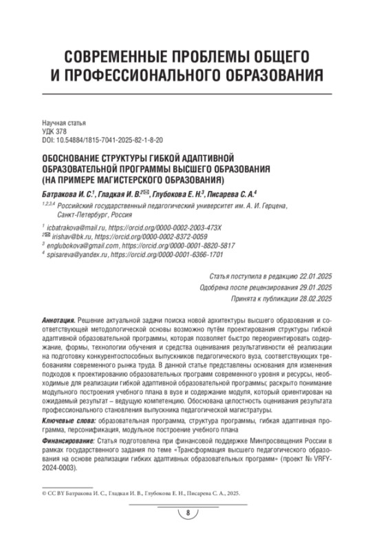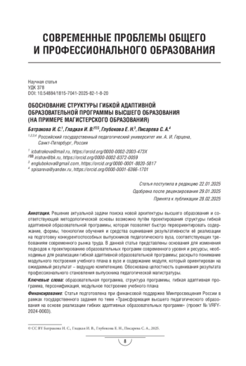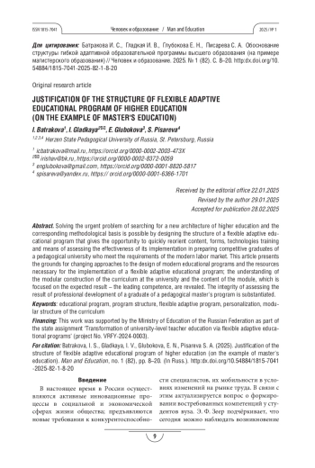 БАТРАКОВА И. С., ГЛАДКАЯ И. В., ГЛУБОКОВА Е. Н., ПИСАРЕВА С. А. ОБОСНОВАНИЕ СТРУКТУРЫ ГИБКОЙ АДАПТИВНОЙ ОБРАЗОВАТЕЛЬНОЙ ПРОГРАММЫ ВЫСШЕГО ОБРАЗОВАНИЯ (НА ПРИМЕРЕ МАГИСТЕРСКОГО ОБРАЗОВАНИЯ) // ЧЕЛОВЕК И ОБРАЗОВАНИЕ. 2025. № 1 (82)
