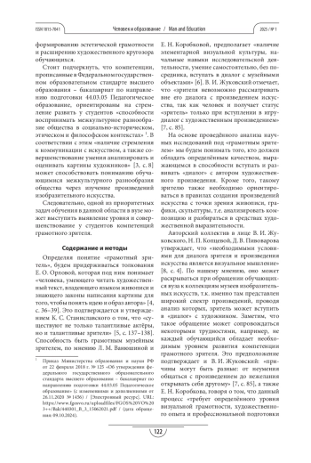Исследуется один из ключевых аспектов учебного процесса в области изобразительного искусства – совершенствование у студента способности восприятия художественных произведений как проявление его компетенции грамотного зрителя. Нацеленность на этот аспект обусловлена содержательными и педагогическими особенностями данного исследования, которые нашли отражение в соответствующих нормативных документах. В статье дано определение понятия «грамотный зритель», представлены качества, которые присущи такому человеку. В исследовании подробно описана диагностика, которая была проведена в одном из учреждений высшего образования города Великий Новгород. Содержание диагностического исследования направлено на определение уровня восприятия произведений искусства студентом, стремящимся проявить свою компетенцию грамотного зрителя. В выводах описаны результаты диагностической работы.