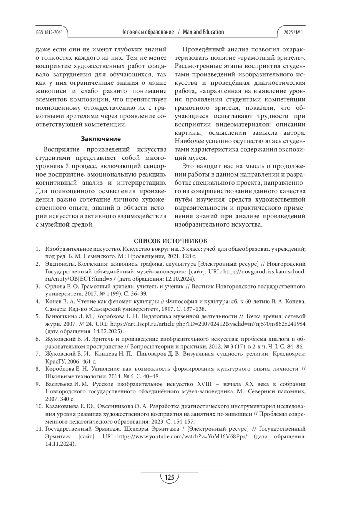 10. Казаковцева Е. Ю., Овсянникова О. А. Разработка диагностического инструментария исследования уровня развития художественного восприятия на занятиях по живописи // Проблемы современного педагогического образования. 2023. С. 154-157.