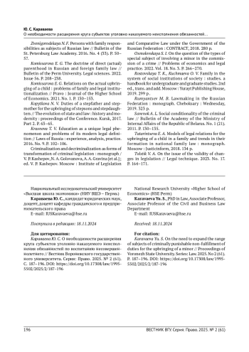 8. Западнова Ю. А. Неисполнение обязанностей по воспитанию несовершеннолетнего: проблемы установления признаков специального субъекта преступления // Вестник экономической безопасности. 2016. № 6. С. 60-65.