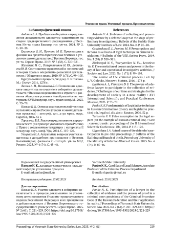 1. Авдонин В. А. Проблемы собирания и представления доказательств адвокатом-защитником на стадии предварительного расследования // Вестник Ин-та права Башкир. гос. ун-та. 2024. № 2. С. 20-28.
