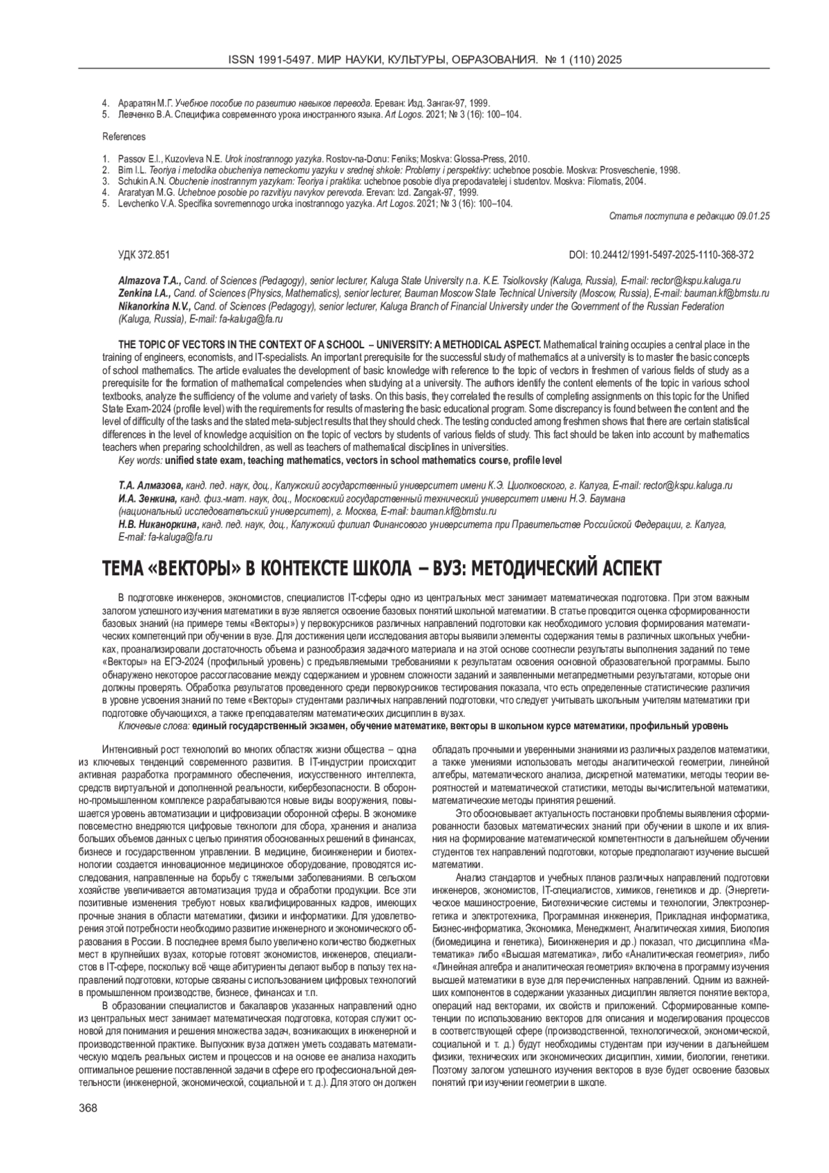В подготовке инженеров, экономистов, специалистов IT-сферы одно из центральных мест занимает математическая подготовка. При этом важным залогом успешного изучения математики в вузе является освоение базовых понятий школьной математики. В статье проводится оценка сформированности базовых знаний (на примере темы «Векторы») у первокурсников различных направлений подготовки как необходимого условия формирования математических компетенций при обучении в вузе. Для достижения цели исследования авторы выявили элементы содержания темы в различных школьных учебниках, проанализировали достаточность объема и разнообразия задачного материала и на этой основе соотнесли результаты выполнения заданий по теме «Векторы» на ЕГЭ-2024 (профильный уровень) с предъявляемыми требованиями к результатам освоения основной образовательной программы. Было обнаружено некоторое рассогласование между содержанием и уровнем сложности заданий и заявленными метапредметными результатами, которые они должны проверять. Обработка результатов проведенного среди первокурсников тестирования показала, что есть определенные статистические различия в уровне усвоения знаний по теме «Векторы» студентами различных направлений подготовки, что следует учитывать школьным учителям математики при подготовке обучающихся, а также преподавателям математических дисциплин в вузах.