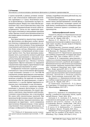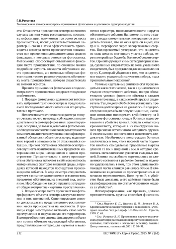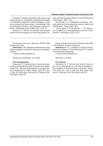 РОМАНОВА Г. В. ТАКТИЧЕСКИЕ И ЭТИЧЕСКИЕ ВОПРОСЫ ПРИМЕНЕНИЯ ФОТОСЪЕМКИ В УГОЛОВНОМ СУДОПРОИЗВОДСТВЕ // ЯЗЫК, КОММУНИКАЦИЯ И СОЦИАЛЬНАЯ СРЕДА. 2025. № 23