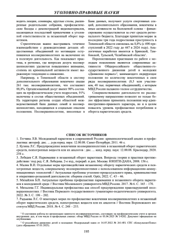 1. Готчина Л.В. Молодежный наркотизм в современной России: криминологический анализ и профилактика: автореф. дис.... д-ра юрид. наук: 12.00.08. Санкт-Петербург, 2011. 46 с. EDN: ZOHUWL