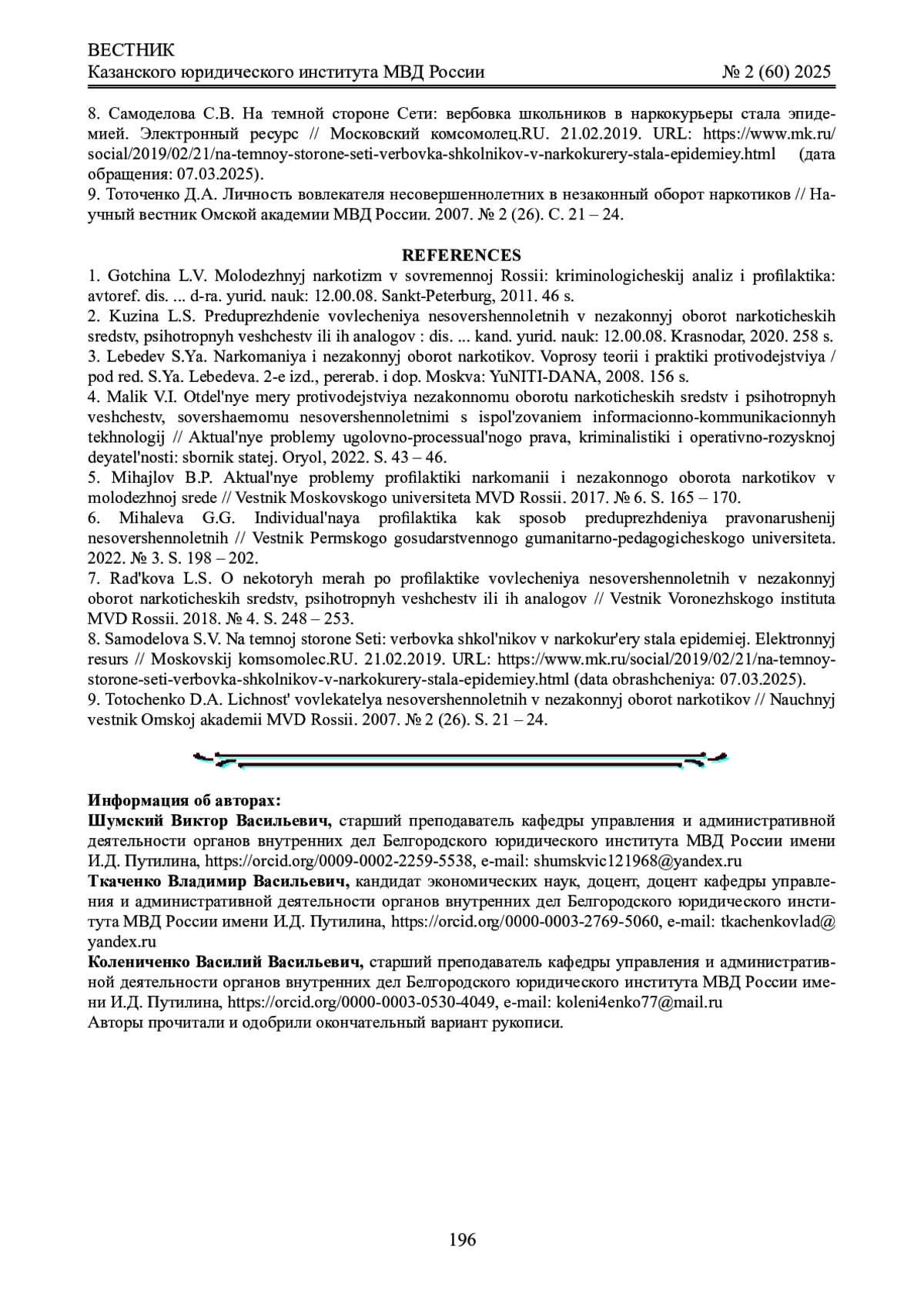 2. Кузина Л.С. Предупреждение вовлечения несовершеннолетних в незаконный оборот наркотических средств, психотропных веществ или их аналогов: дис.... канд. юрид. наук: 12.00.08. Краснодар, 2020. 258 с. EDN: BIWKYY
