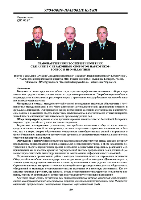 Обсуждение и заключение: в результате исследования аргументируется вывод, согласно которому профилактику противоправных деяний, совершаемых несовершеннолетними, в сфере незаконного потребления и оборота наркотических средств необходимо осуществлять посредством реализации мер, принимаемых как со стороны субъектов государственной системы профилактики, так и родителей (законных представителей), акцентируя внимание на использовании информационных технологий. Перспективными практиками по работе с молодым поколением являются современные активности Общероссийского общественно-государственного движения детей и молодежи «Движение первых», занимающего лидирующее положение по количеству вовлеченных в свои ряды несовершеннолетних. Стратегически важно выстраивать точечное взаимодействие с руководителями детских общественных объединений по мотивации несовершеннолетних на включение их в полезную деятельность. Как показывает практика, в регионах, где вопросам досуга несовершеннолетних уделяется повышенное внимание, степень их криминальной активности имеет выраженную тенденцию к снижению.