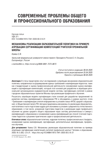 В статье представлен опыт исследований и апробации механизмов образовательной политики, направленных на формирование единых требований к квалификации педагогов, таких как стандартизация и оценка профессиональной деятельности (независимая оценка квалификаций и сертификация компетенций), который стал основой для разработки и апробации региональной организационно-содержательной модели системы сертификации учителей в рамках городских образовательных проектов Москвы при реализации профильного обучения.