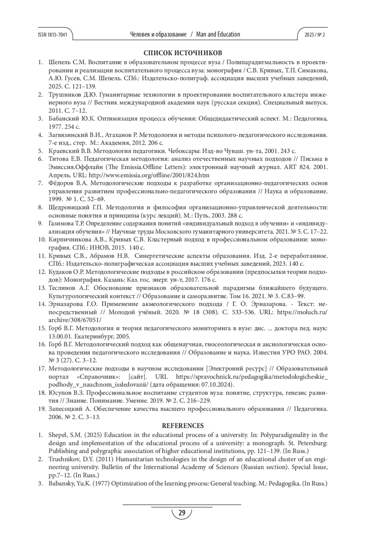 6. Титова Е.В. Педагогическая методология: анализ отечественных научных подходов // Письма в Эмиссия.Оффлайн (The Emissia.Offline Letters): электронный научный журнал. ART 824. 2001. Апрель. URL: http://www.emissia.org/offline/2001/824.htm