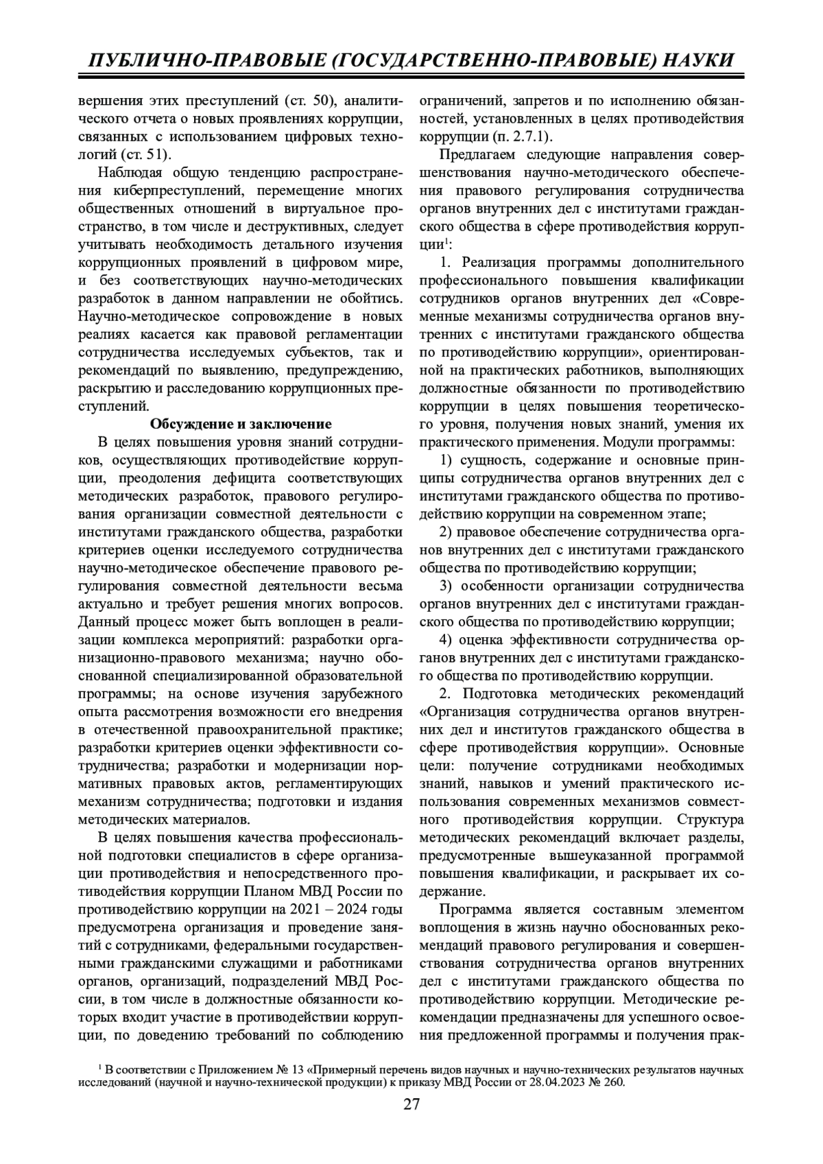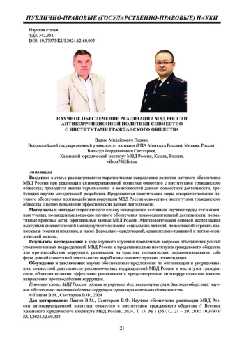 Обсуждение и заключение: научно обоснованные предложения по оптимизации и упорядочиванию совместной деятельности уполномоченных подразделений МВД России и институтов гражданского общества позволят эффективно реализовывать предусмотренные антикоррупционным законом направления противодействия коррупции.