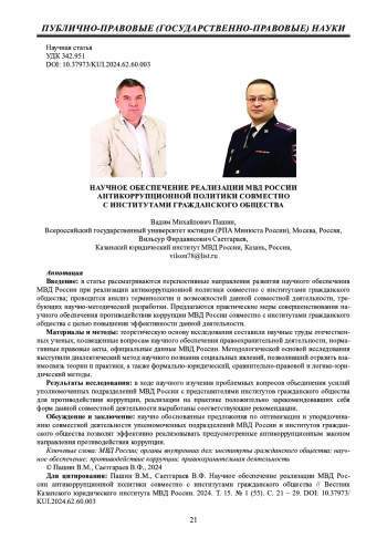 Введение: в статье рассматриваются перспективные направления развития научного обеспечения МВД России при реализации антикоррупционной политики совместно с институтами гражданского общества; проводится анализ терминологии и возможностей данной совместной деятельности, требующих научно-методической разработки. Предлагаются практические меры совершенствования научного обеспечения противодействия коррупции МВД России совместно с институтами гражданского общества с целью повышения эффективности данной деятельности.