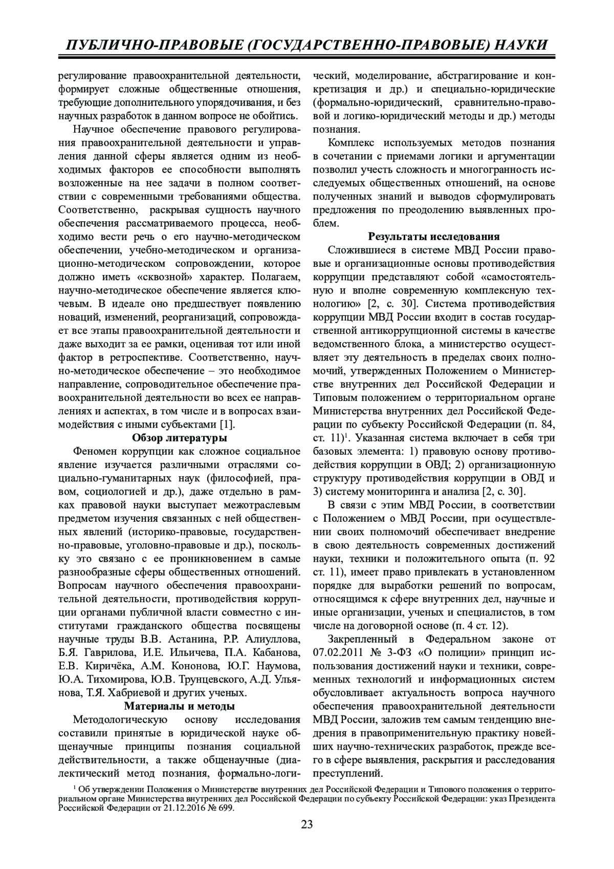 Материалы и методы: теоретическую основу исследования составили научные труды отечественных ученых, посвященные вопросам научного обеспечения правоохранительной деятельности, нормативные правовые акты, официальные данные МВД России. Методологической основой исследования выступили диалектический метод научного познания социальных явлений, позволивший отразить взаимосвязь теории и практики, а также формально-юридический, сравнительно-правовой и логико-юридический методы.