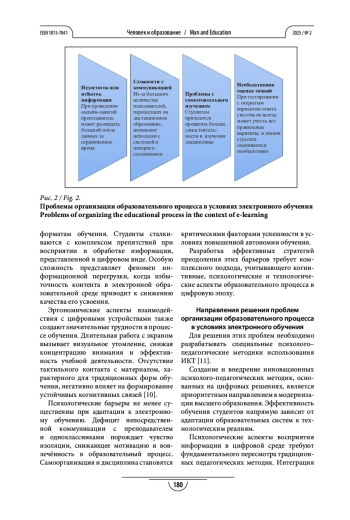 За последние 10 лет использование цифровых медиа значительно возросло и данное направление в обучении приобрело особую значимость. В статье рассмотрены аспекты эффективности усвоения учебной информации студентами в рамках психолого-педагогических аспектов, актуальных в современных условиях развития электронного обучения. Цель статьи – охарактеризовать психолого-педагогические аспекты эффективности усвоения учебной информации студентами в условиях электронного обучения. Исследование включило изучение практических методик и теоретических концепций, направленных на анализ психологических и педагогических факторов, влияющих на качество восприятия информации студентами в цифровой образовательной среде. Исследование позволило выявить ключевые проблемы, возникающие при работе студентов с информацией в электронной образовательной среде. Анализ различных психолого-педагогических концепций восприятия учебного материала дал возможность сформулировать конкретные рекомендации по совершенствованию обучения, а также предложить эффективные пути преодоления обнаруженных трудностей.