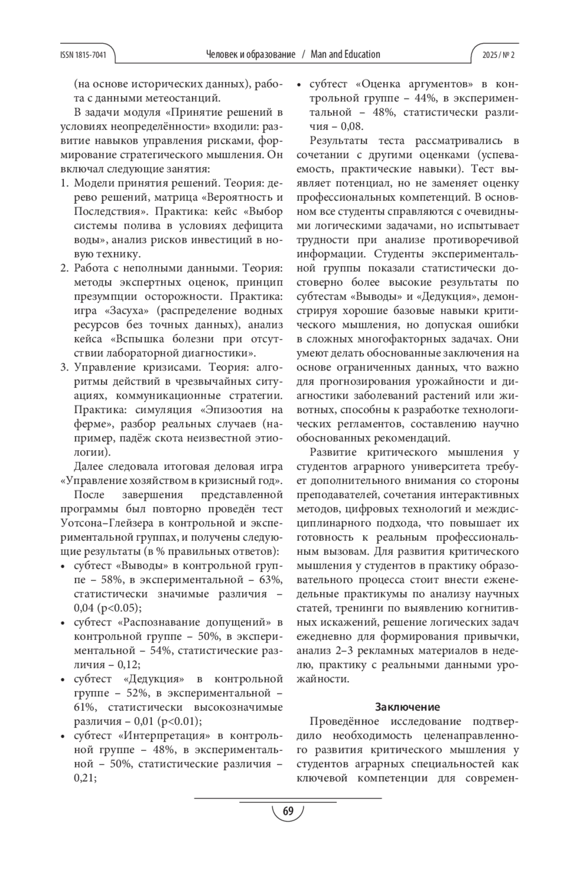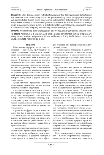 В статье рассматриваются актуальные методы развития критического мышления у студентов аграрных вузов в условиях цифровизации и глобализации сельского хозяйства. Обосновывается положение о том, что в условиях глобальных вызовов критическое мышление перестаёт быть «мягким навыком», а становится стратегическим ресурсом для обеспечения качества подготовки студентов. Анализируются педагогические технологии развития критического мышления, такие как кейс-стади, дебаты, проектное обучение и цифровые инструменты, способствующие формированию аналитических навыков, необходимых для решения сложных агропромышленных задач. Приводятся результаты экспериментального исследования, проведённого среди студентов Санкт-Петербургского государственного аграрного университета, а также рекомендации по интеграции критического мышления в образовательные программы.