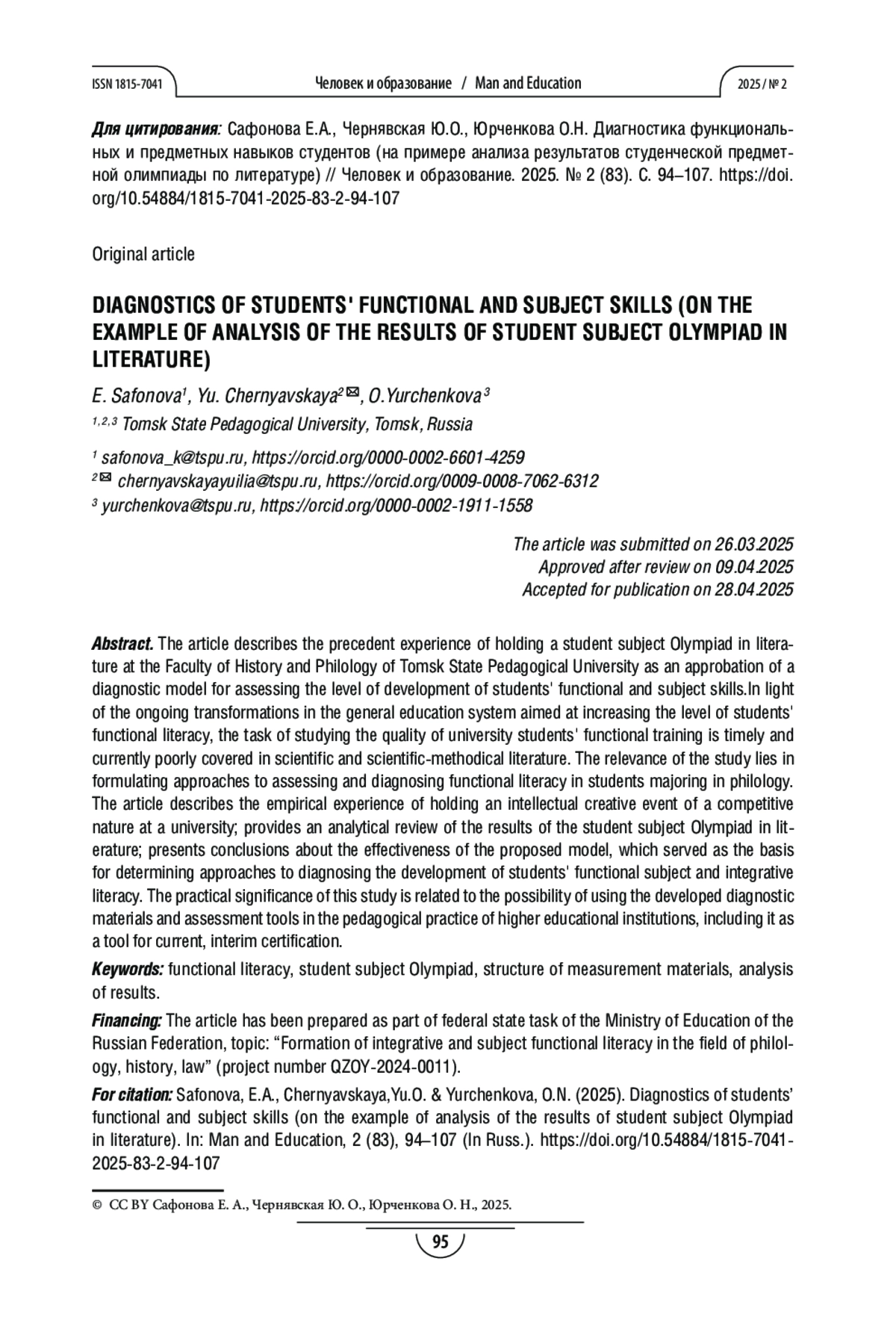 Статья посвящена описанию прецедентного опыта проведения на историко-филологическом факультете Томского государственного педагогического университета студенческой предметной олимпиады по литературе в качестве апробации диагностической модели оценки уровня сформированности функциональных и предметных навыков обучающихся. В свете происходящих трансформаций в системе общего образования, нацеленных на повышение уровня функциональной грамотности обучающихся, задача изучения качества функциональной подготовки студентов вузов – своевременная и в настоящий момент мало освещённая в научной и научно-методической литературе. Актуальность исследования состоит в формулировании подходов к оцениванию и осуществлении диагностики функциональной грамотности у студентов филологического профиля подготовки. В статье описан эмпирический опыт проведения интеллектуального творческого мероприятия конкурсного характера в вузе; дан аналитический обзор итогов студенческой предметной олимпиады по литературе; представлены выводы об эффективности предлагаемой модели, что явилось основой определения подходов к диагностике сформированности функциональной предметной и интегративной грамотности студентов. Практическая значимость настоящего исследования связана с возможностью использования разработанных диагностических материалов и оценочных средств в педагогической практике высших учебных заведений, в том числе в качестве инструмента текущей, промежуточной аттестации.